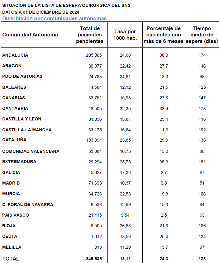 El Ministerio de Sanidad ha publicado la situación a 31 de diciembre de 2023 de las listas de espera de los diferentes sistemas autonómicos de salud.